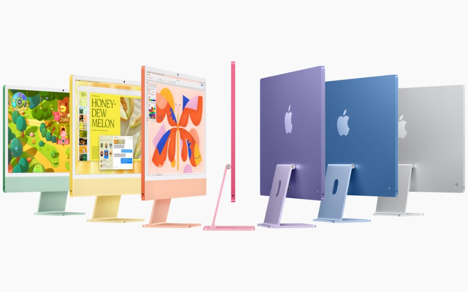 The new iMac is available in an array of new colors (shades of green, yellow, orange, pink, purple, blue and silver), and the 24-inch 4.5K Retina display offers a new nano-texture glass option. iMac features a new 12MP Center Stage camera with Desk View, up to four Thunderbolt 4 ports, and color-matched accessories, including USB-C.
